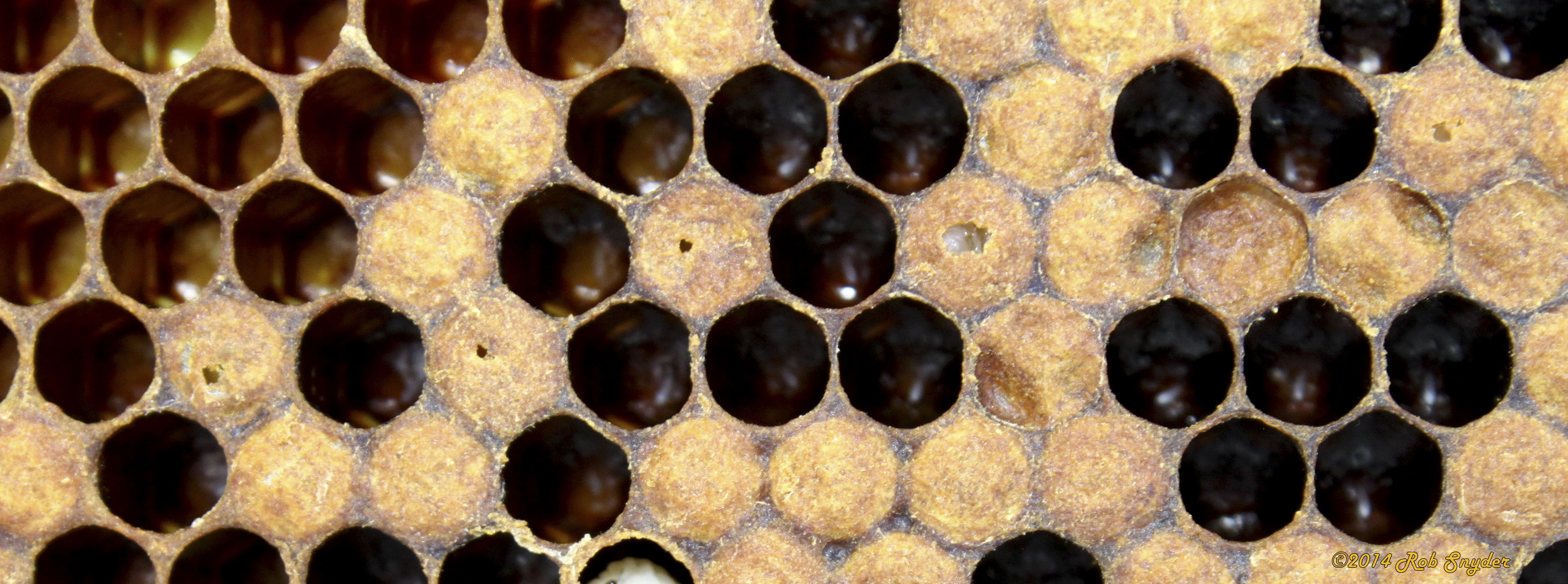 Capped brood appears collapsed, dark, greasy, or punctured. Brood pattern is irregular and spotty.
